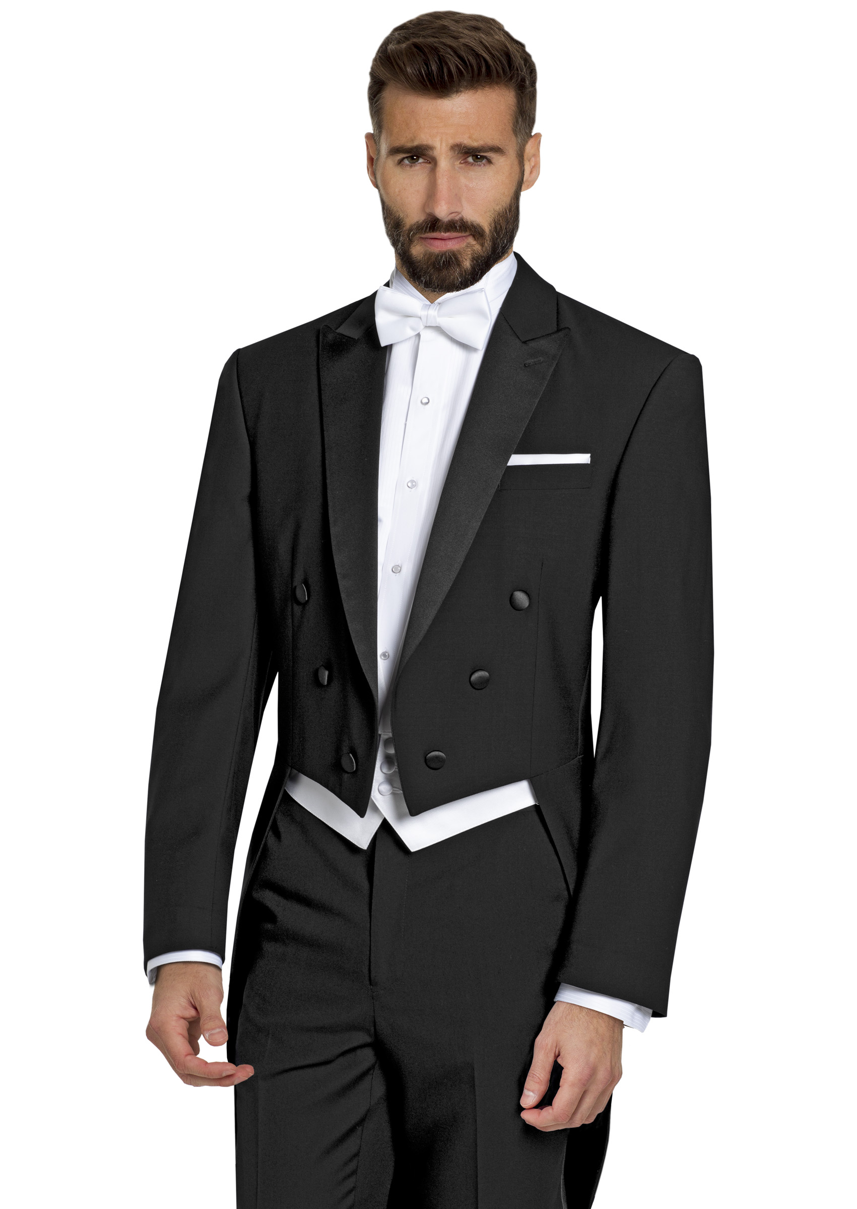 Style features: A classic design in high quality Wool. Full dress tailed tuxedo, three button front. Traditional satin peak lapels and a self top collar.