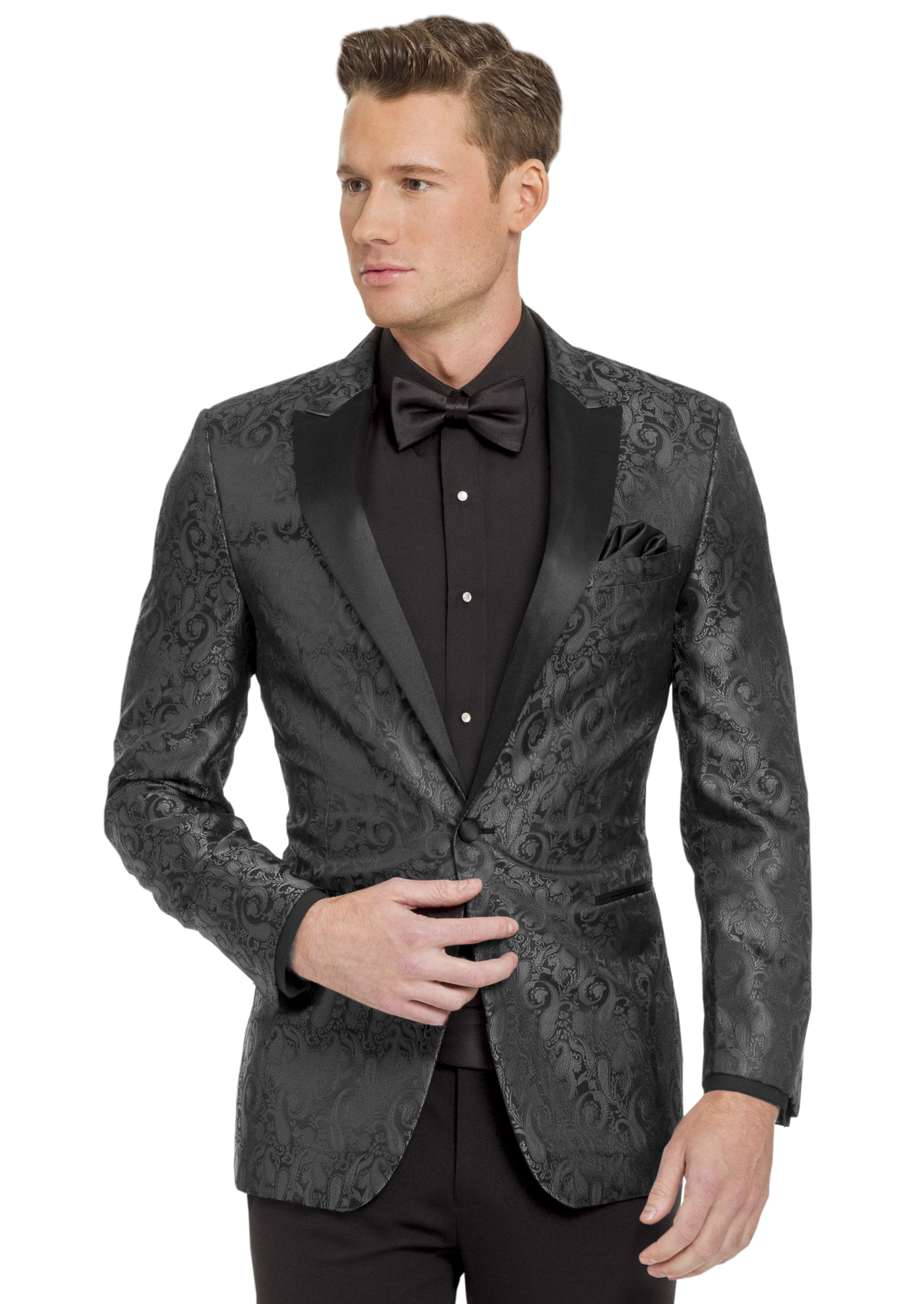 Style features: Sophisticated charcoal paisley fabric Tuxedo jacket with a subtle luster. Trim fit featuring a black solid satin peak lapel and self top collar. One button front, side vented with double besom pock