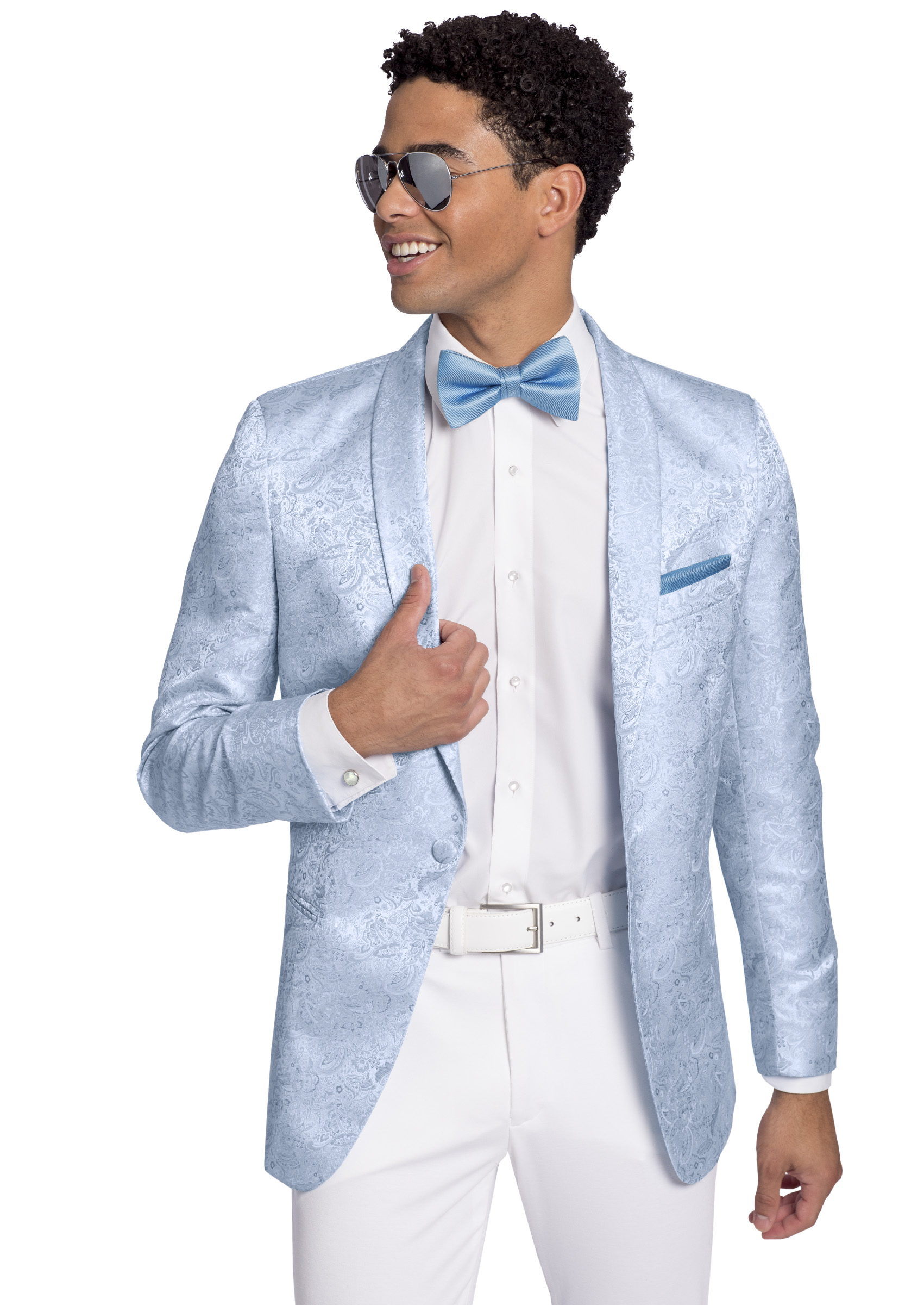 Style features: Sophisticated blue paisley fabric Tuxedo jacket with subtle sheen. Trim fit featuring a matching shawl lapel. One button front, side vented with double besom pockets.